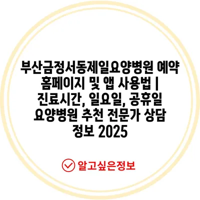 부산금정서동제일요양병원 예약 홈페이지 및 앱 사용법 | 진료시간, 일요일, 공휴일 요양병원 추천 전문가 상담 정보 2025에 대해 알아보겠습니다.