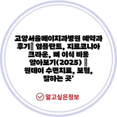 고양서울메이치과병원 예약과 후기| 임플란트, 지르코니아 크라운, 뼈 이식 비용 알아보기(2025) | 원데이 수면치료, 보험, 잘하는 곳